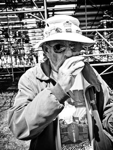 this next image is the one that maybe should be marinating before appearing on this blog … i love this picture, but i love it because i know the story behind it … i was walking behind the grandstands at the grad prix and i noticed this guy. i thought he looked interesting with his hat and buttons so i thought i’d take his picture. well, as i was approaching him i saw him reach into his pocket and pull out a small plastic flask, unscrew the top and take a nip … i was there at the right moment to catch him sneaking a sip from his flask … stoked (sidenote: someone needs to buy this guy a cooler flask … this looked like a “travel-sized” bottle of lotion that he washed out.)